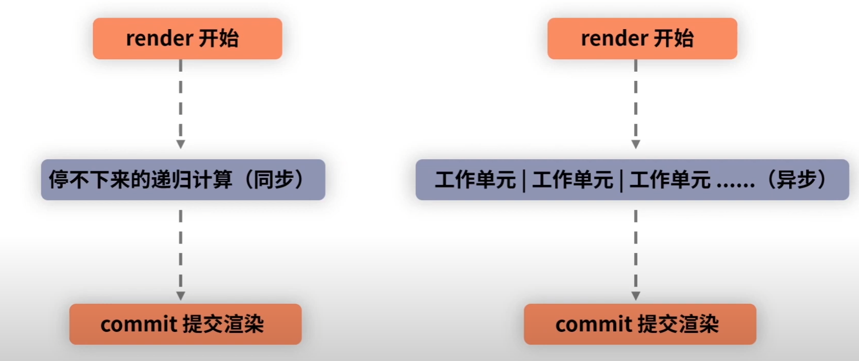 render做的事情很清晰,就是根据element的信息,生成真实的dom然后挂载,对于其中的子节点,我们只是粗暴的递归之。设想一下,如果我们传入的是一个巨深的虚拟dom,那么会发生什么?render这个函数的耗时势必也会剧增,一旦开始执行,就会执行到底。即:从首次执行render开始到最终结束,期间的浏览器都是处于阻塞的状态。此时是无法响应任何用户的操作的。俗称卡死。