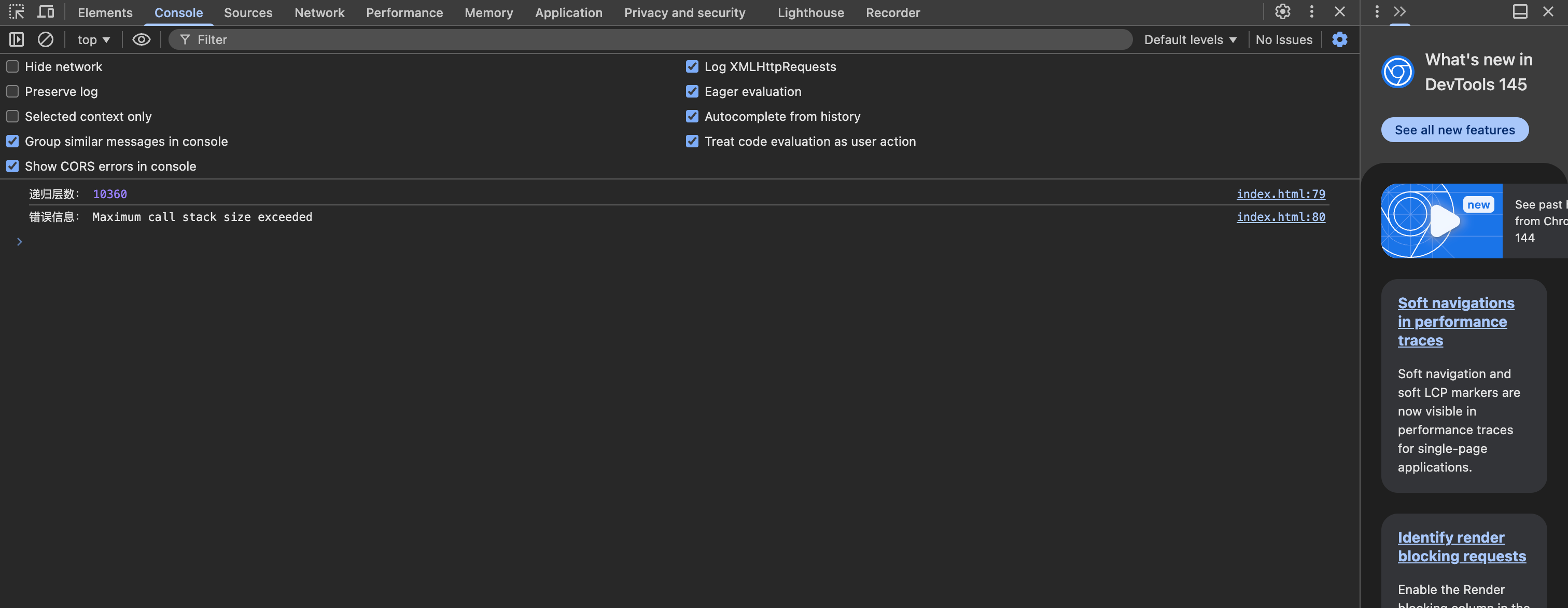console.log('递归层数:', stackCount); // Chrome中约 10000 层